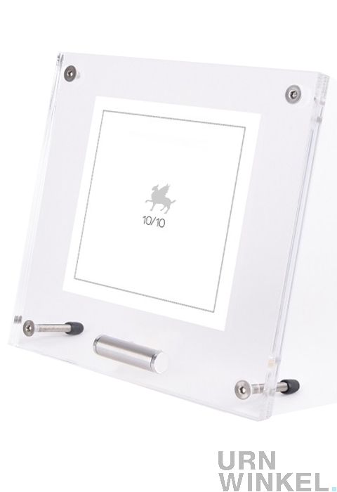 Deze fotolijst mini urn is gemaakt om de foto van uw dierbare te laten zien. Op de transparante lijst van plexiglas zit een ashouder. Hierin kan een kleine hoeveelheid crematie as geplaatst worden. De ashouder is zowel boven als onder te plaatsen, maar ook aan de linker- of rechterkant). Fotoformaat: 10×10 cm.